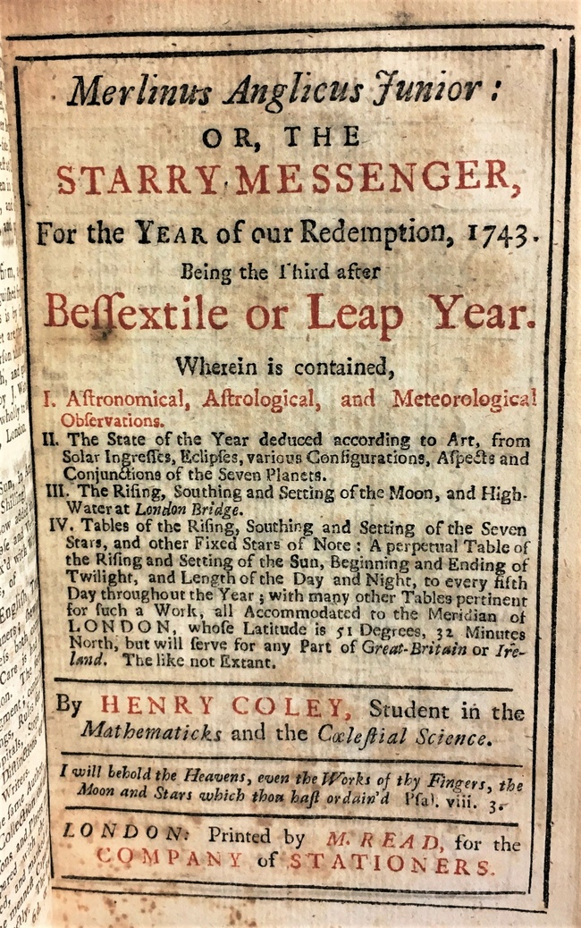 This is how it was published until his death in 1704 when, even though Coley could not continue in person, his name as compiler/author was still on the title page of the Starry Messenger (below) through most of the eighteenth century.